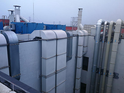 4、室外噪聲應控制在70dB(A),實驗室內噪聲應控制在55dB(A),(室內噪聲GB60分貝超標,室外噪音大約為75分貝)。風機的噪聲可以分為本身的機械噪聲(此噪聲主要由風扇質量不同引起)和風聲(為主要噪聲)。在風機功率不大的情況下,可通過在風機上方加防雨罩來消除風聲,在使用大功率風機時一般在風機進出口加消聲器來消除風聲,機械噪聲主要靠建隔音墻、小黑屋或在風機進出口加軟接頭來解決,減振的主要方法為風機底座做成減振底座并安裝減振器或加裝減振墊。